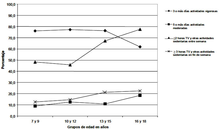 Se interrogó por las actividades realizadas en los últimos 7 días, con un instrumento validado para este grupo de edad, utilizado en encuestas nacionales americanas por el Youth Risk Behavior Survey (YRBS)(17). Actividad física vigorosa número de días de “actividad deportiva, por lo menos, durante 20 minutos que le hacen sudar o acortar la respiración, tales como: Fútbol, baloncesto, trote, natación, tenis, bicicleta rápida o actividades aeróbicas similares”. Actividades moderadas: Número de días de “caminar o montar en bicicleta por más de 30 min. continuos”. Actividades de Flexibilidad: Número de días de “ejercicios de estiramientos musculares, tales como tocar la punta de los pies sin doblar las rodillas, doblar rodillas a tocar el pecho, tocar con el talón la nalga, participar en artes marciales o Yoga”. Actividades de fuerza: Número de días de “ejercicios de fortalecimiento o tonificación muscular, tales como, sentadillas, abdominales, flexiones de pecho, levantamiento de pesas, porras o caminata de montaña”. Actividades sedentarias entre semana: Número promedio de horas diarias (entre semana) de actividades sedentarias como ver TV, videojuegos o Internet. Actividades sedentarias en el fin de semana: Número promedio de horas de actividades sedentarias en fin de semana.