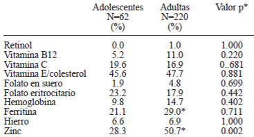 La deficiencia de vitamina A no es un problema de salud pública en esta población. Sin embargo, se observaron prevalencias elevadas de anemia y de deficiencias de hierro, folato eritrocitario, vitaminas C y E, así como de zinc (Tabla 3). En el caso de este último la prevalencia fue significativamente mayor en el caso de las adultas (p<0.002). La Tabla 4 muestra la asociación entre las deficiencias de micronutrimentos y la probabilidad de presentar CAR, de acuerdo con el cuestionario breve. Ninguno de los indicadores analizados mostró asociación con esa puntuación. Tampoco se encontraron diferencias entre los grupos que realizaban o no ejercicio de manera regular, ni de acuerdo a las prácticas de vómito autoinducido, uso de diuréticos, laxantes, o dietas.