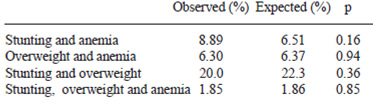 Since anemia and malnutrition often share common causes, it is expected that multiple nutrition problems would co-occur in the same individuals. Our data showed that children with low Hb had also low HAZ and WAZ. However, the comparison of observed and expected values were not significant difference; it may due to loss of power when we categorized Hb, HAZ and WAZ as dichotomous variables.