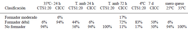 Cuando se utiliza el suero de queso como sustrato, únicamente 6% de las cepas que se incuban a temperatura ambiente se comportan como formadoras débiles de biopelículas y a 35ºC el 100% se comporta como no formador.