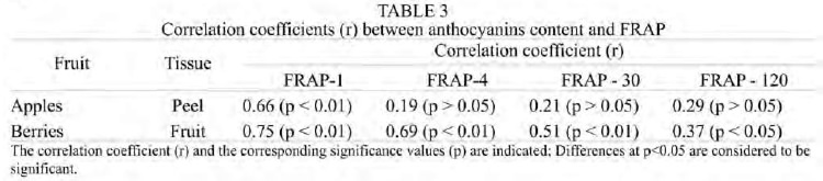 Therefore, the aims of the present study were: 1) to evaluate the antioxidant capacity of various apples and berries using the standard FRAP methodology, 2) to propose and apply new FRAP indexes, depending on the reaction time allowing the formation of Fe2+-TPTZ. In addition, the correlations between the antioxidants content (phenolics and anthocyanins) and FRAP indexes are evaluated.