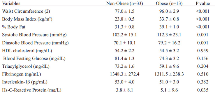 All individuals were instructed to avoid alcohol, caffeine and cigarettes on the day before the blood collection and anthropometric assessment. Blood samples were obtained from the antecubital vein after 12h of fasting, and biochemical analysis of glucose, total cholesterol, high-density lipoprotein cholesterol (HDL-c) and trilglycerols (TAG) were performed using commercial kits (Labtest Diagnostica SA, Brazil). Low-density lipoprotein cholesterol (LDL-c) was calculated using the Friedewald equation. Kits for enzyme-linked immunosorbent assay were used to assess circulating levels of interleukin (IL)-1β and tumor necrosis factor-alpha (TNF-α) (R & D Systems, Minneapolis, MN, USA), fibrinogen and high-sensitivity C-reactive protein (hs-CRP) (Immunology Consultants Laboratory, Newberg, OR, USA).