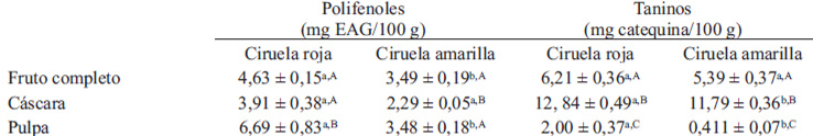 La ciruela roja mostró mayor contenido de polifenoles y taninos, además de una mayor capacidad antioxidante que la variedad amarilla. La naturaleza y distribución de los compuestos polifenólicos es diferente en cada una de las partes de la fruta y depende de la variedad. El proceso de escaldado aumenta el contenido de polifenoles presentes en la ciruela, por lo que se recomienda dicho tratamiento como alternativa de consumo y conservación.