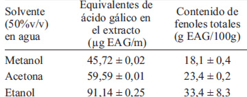 Varios estudios, incluyendo los de Perva Uzunalic (6) y Nihal Turkmen (17), han probado varios solventes y concentraciones de éstos para determinar el más eficiente en la extracción de compuestos fenólicos. A diferencia del presente estudio, ambos seleccionan a la acetona, poniendo de manifiesto la influencia e importancia de las condiciones de extracción utilizadas en el resultado final.