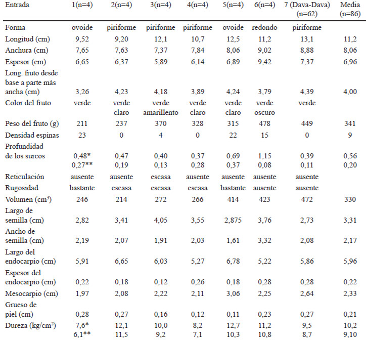 Los criterios para la caracterización del fruto fueron los indicados por diferentes investigadores (4,8). Adicionalmente a dichos criterios sedeterminaron dos nuevos parámetros morfológicos definidos por el grupo de trabajo por considerarlos de interés para el comercio, tales como: densidad de espina y dimensión del endocarpio. En la Figura 1 se muestran algunos de los descriptores utilizados en la caracterización morfológica de las muestras.