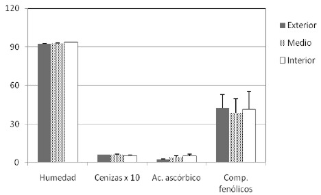 En la Figura 2 se presentan los resultados de algunos componentes relevantes (humedad, cenizas, ácido ascórbico y compuestos fenólicos) correspondiente a tres partes (exterior, media e interior) de 6 frutos de la chayota Dava-Dava, analizada de forma independientemente. Los contenidos de cenizas y compuestos fenólicos totales no mostraron diferencias significativas entre los valores medios obtenidos en las tres partes consideradas, sin embargo, la parte interior del fruto tenía más contenido de agua que las otras dos; mientras que en contenido de ácido ascórbico (AA) se incrementó, de forma significativa, a medida que se avanza hacia el interior del fruto.
