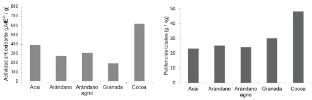 Por otra parte, los compuestos fenólicos están relacionados con la calidad sensorial de los alimentos de origen vegetal. Su contribución a la pigmentación de los alimentos vegetales está claramente reconocida, por ejemplo, las antocianidinas, son responsables de los colores rojo, azul, violeta, naranja y púrpura de muchos frutos clasificados incluso como “superfrutos” por su notable actividad antioxidante (41) y que, en cacao se ha demostrado el contenido de polifenoles y potencial antioxidante es superior (Figura 1). Así también, los compuestos fenólicos, particularmente los taninos condensados o proantocianidinas se asocian con la astringencia que presentan muchos frutos, como lo es el cacao al momento de ser cosechado.
