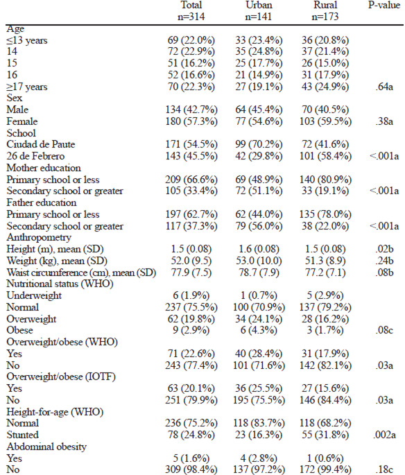 Key words: Adolescent; rural population; urban population; overweight; obesity; Ecuador.