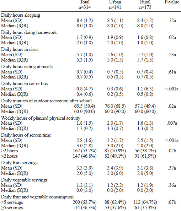 When comparing physical activity habits and fruit and vegetable consumption frequency by residence (Table 2), students with rural residence spent fewer hours doing homework daily (1.6 vs. 1.9; P=.02), spent more hours in a car or bus daily (1.1 vs. 0.3; P<.001), had fewer daily minutes of outdoor recreation outside of school (57.1 vs. 76.0; P=.02), had fewer weekly hours of planned physical activity (1.6 vs. 2.0; P=.007), and had fewer hours of screen time (2.5 vs. 3.2; P<.001), compared with students with urban residence. The majority of students had <5 servings of fruits and vegetables daily, but there were no significant differences detected between urban and rural groups.
