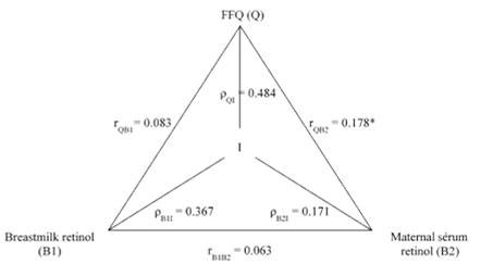 Figures 1 and 2 present the results of FFQ analysis by the method of triads - with all items (carotenoids and retinol food sources) and with only preformed vitamin A food sources, respectively. The best validity coefficient for the FFQ was obtained in the triangular comparison between the biomarkers of retinol in breast milk and in the mother’ serum when only preformed vitamin A food sources were considered.