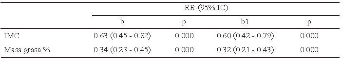 Se realizó también el análisis de regresión lineal de Spearman solo para IMC y porcentaje de masa grasa, ya que se considera que las mediciones de cintura y cadera son variables componentes de la composición corporal. Además de lo anterior, con propósitos de ajuste en los modelos de regresión se hizo corrección por concentración de triglicéridos ya que esta molécula se encuentra íntimamente relacionada con alteraciones metabólicas inducidas por desbalance energético cuando las dietas son de alto consumo de carbohidratos o por predisposición genética y este mecanismo impacta de manera directa en la composición corporal al presentar hiperplasia e hipertrofia del tejido adiposo, que se refleja sobretodo en depósitos centrales (Tabla 3).