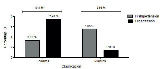 De acuerdo con la tensión arterial sistólica, el 91,09% de la población tuvo una presión arterial normal. Sin embargo, el 8,9% de los adolescentes tuvo prehipertensión o hipertensión (Figura 3) y fue más frecuente en hombres (10,8%) que en mujeres (6,93%) de manera estadísticamente significativa (p = 0,032).