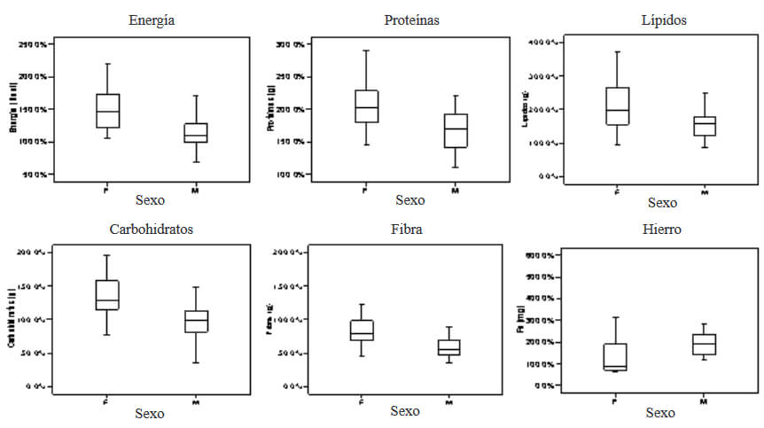Respecto al sexo del encuestado, observamos diferencias significativas en el % de adecuación de la ingesta de macronutrientes, fibra y hierro (Figura 1), con una mayor ingesta de estos nutrientes en el grupo femenino, excepto hierro.