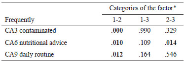 For factors with three or more classification categories, the Kruskal–Wallis test was used (p<0.05): age groups, household type, household size, income, and religion. In the cases where the Kruskal–Wallis test was significant (p<0.05), Mann–Whitney U tests were applied to the two-by-two comparisons of the factor categories. Table 4 shows the significance levels for the Kruskal–Wallis tests and tables Z1 to Z5, the significance levels obtained by the Mann–Whitney U test when the Kruskal–Wallis levels were significant (p<0.05).