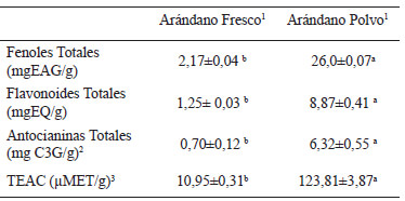 En la Tabla 1 se muestra el contenido de fenoles, flavonoides y antocianinas totales así como también la actividad antioxidante presente en arándano fresco y polvo antes del proceso de digestión. Se observa que los componentes fenólicos en su conjunto y actividad antioxidante mostraron valores más altos en la muestra liofilizada. Este incremento fue del orden de 11,0, 6,1, 7,9 y 10,3 veces más alto para fenoles, flavonoides antocianinas totales y actividad antioxidante respectivamente.