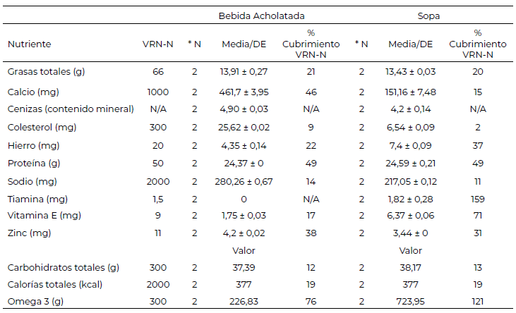En el complemento tipo bebida achocolatada se encontró que este puede considerarse como excelente fuente de proteína, zinc, calcio ya que cubre el 49%, 38% y 46% respectivamente de los VRN-N; y buena fuente de hierro y vitamina E donde cubre el 22% y el 17% respectivamente de los VRN-N, mientras que el complemento tipo sopa puede considerarse excelente fuente de proteína, zinc, hierro, tiamina, vitamina E cubriendo el 49%, 31%, 37%, 15% y 71% respectivamente de los VRN-N, de igual forma de omega 3 ya que aporta más de 600mg/100g del complemento; y buena fuente de calcio donde cubre el 15% del VRN-N. Los resultados de la caracterización fisicoquímica y nutricional se pueden observar en la Tabla 5.